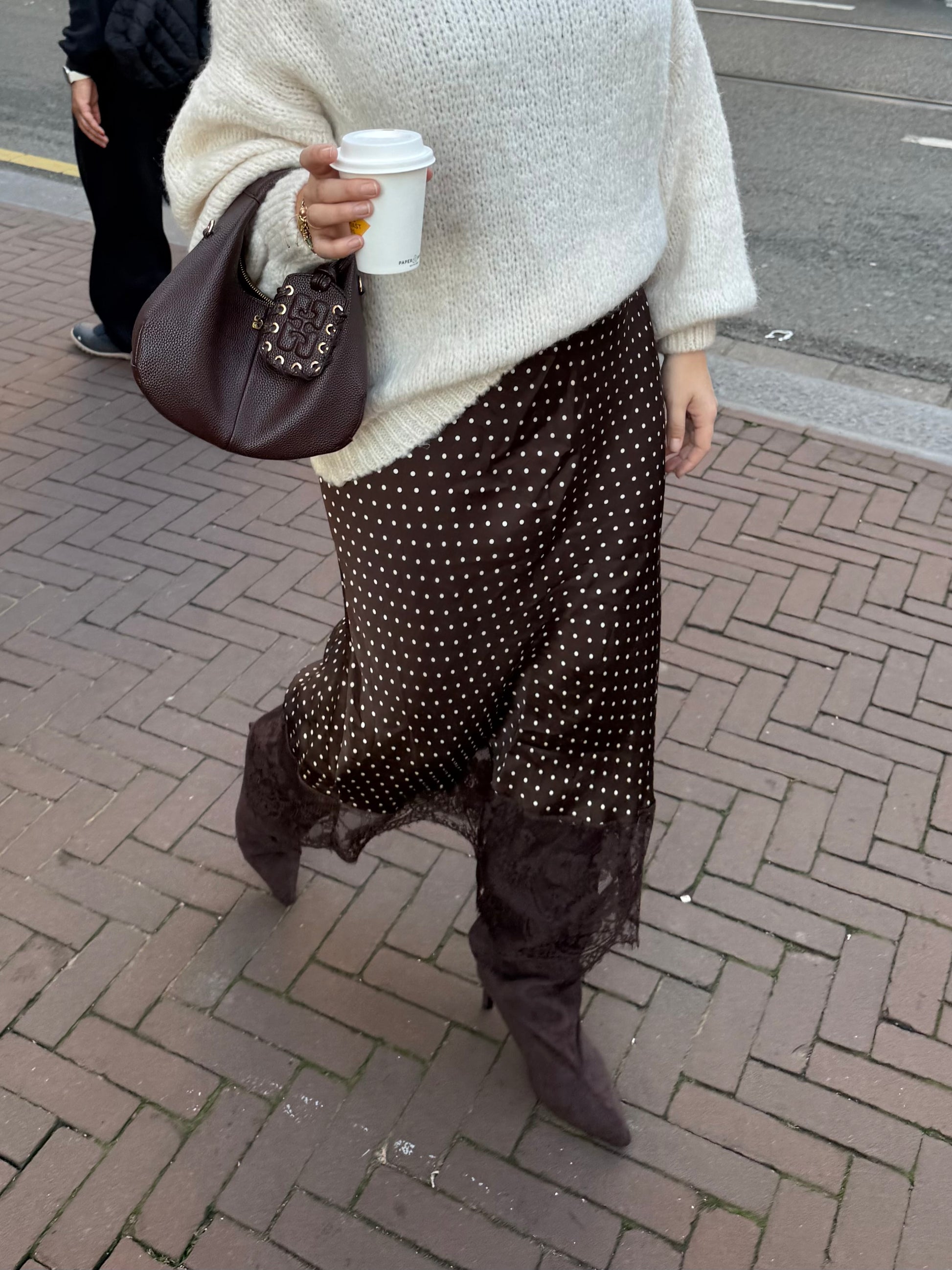 De polka dots zie je veel, samen met kant en natuurlijk de trendkleur bruin. De Livia Dot Rok heeft het allemaal. Leuk om te dragen met de Lizzy Trui maar ook voor de feestdagen met een mooie blouse. Bij de taille zit elastiek, waardoor de rok te dragen is tussen een XS t/m XL.