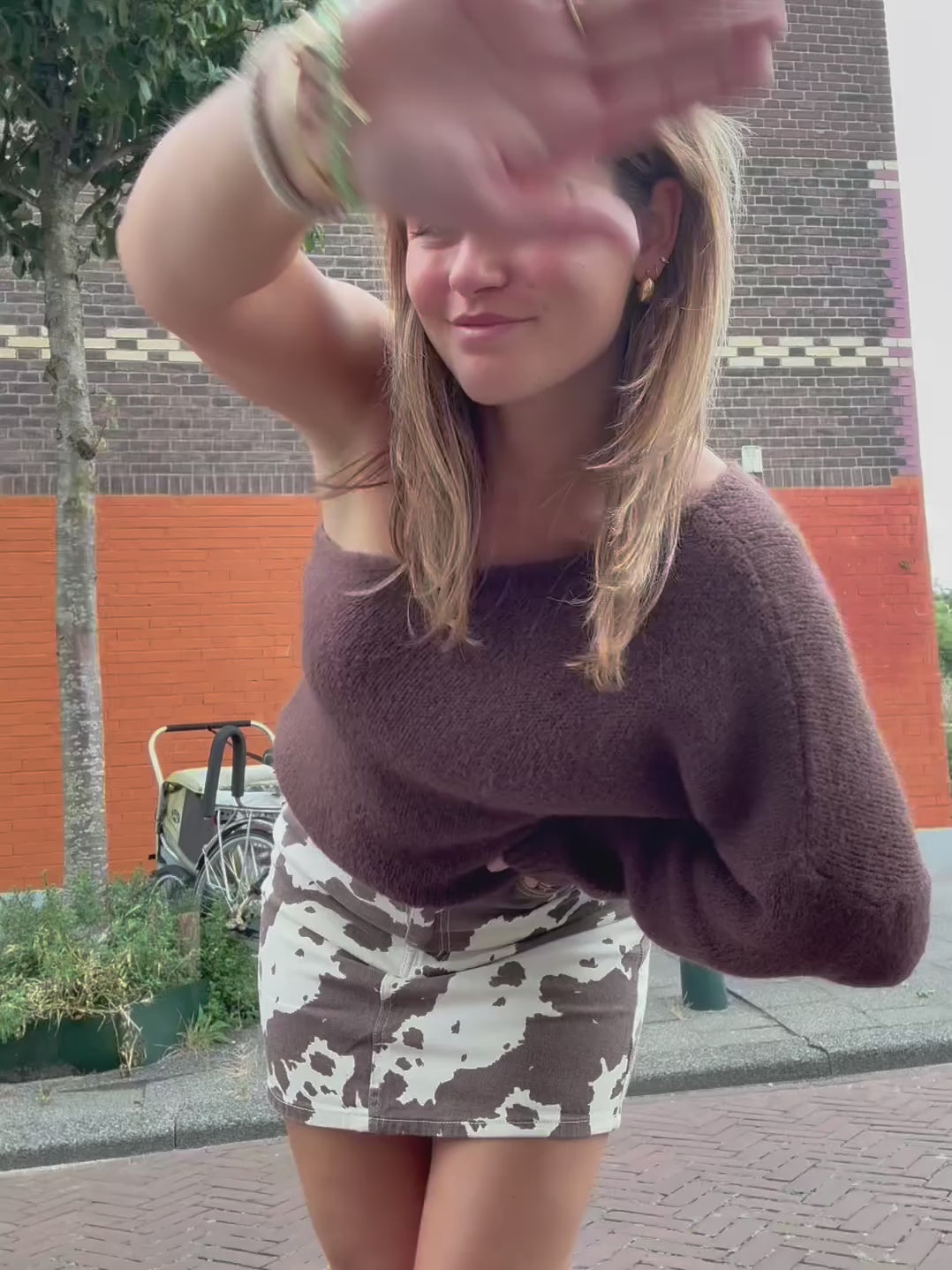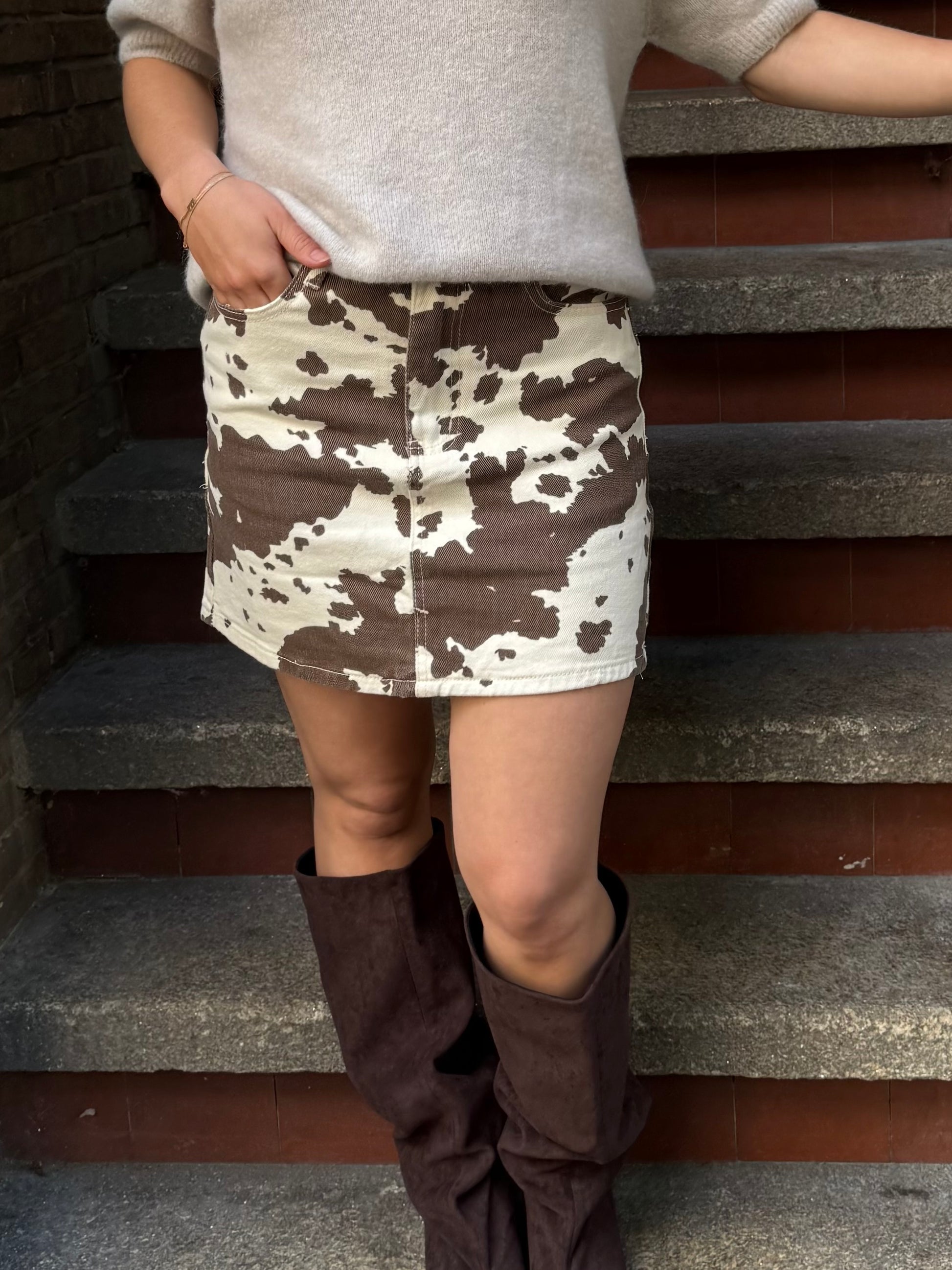 Animal prints ga je veel zien, vooral veel koeienprint. Deze katoenen rok is leuk te combineren met een leuke trui of juist een tof blousje, de Isabeau haklaars of juist de Chloe ballerina.