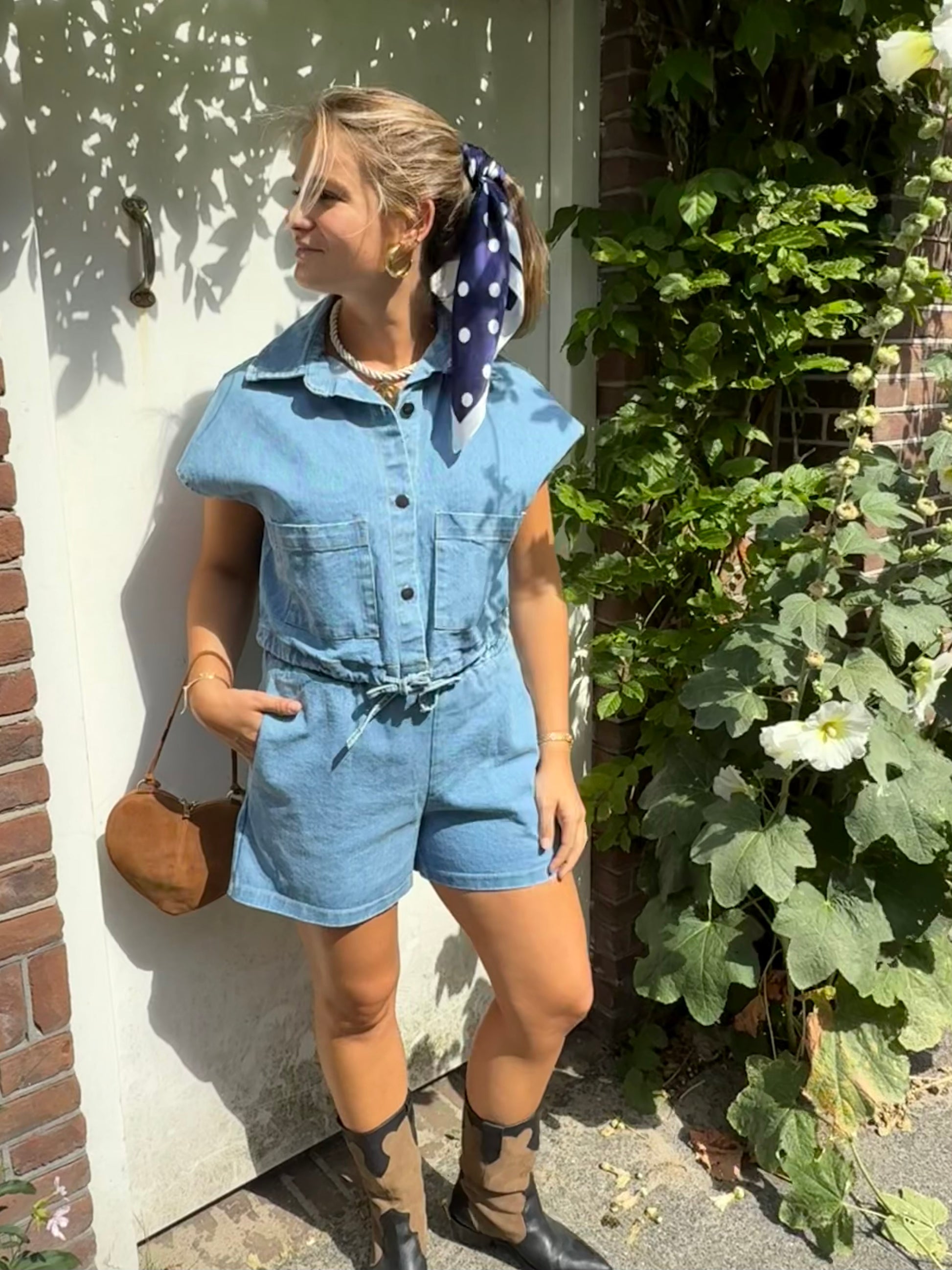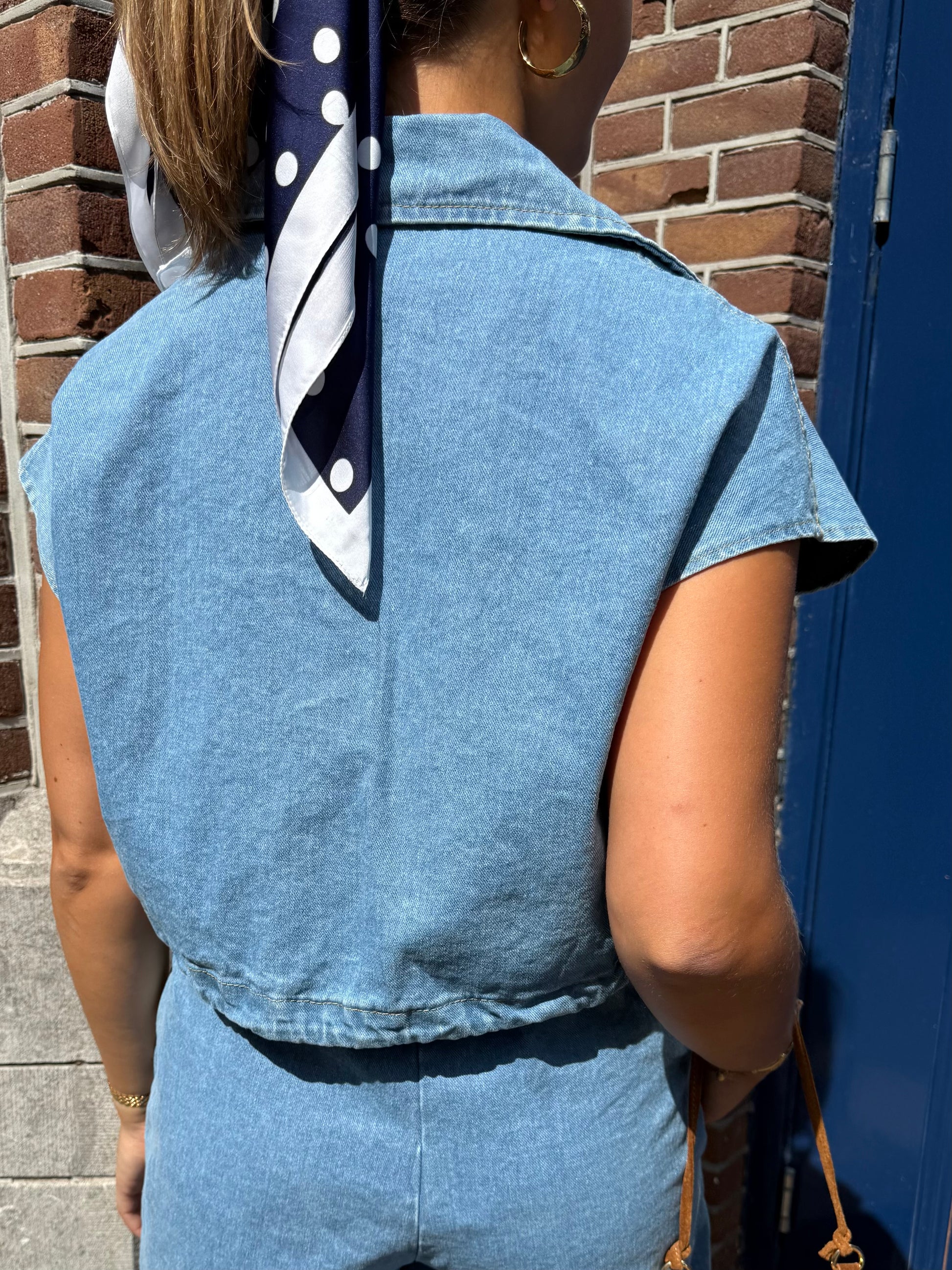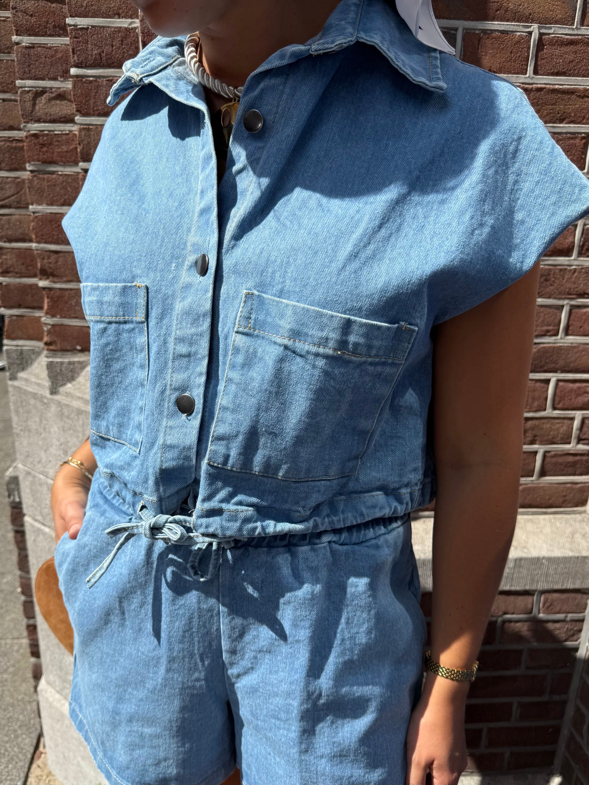 Co-ord setje, we houden ervan! Met de Tess Denim Short maakt het een enige set. Aan de onderkant zit een touwtje waarmee je hem losser en strakker kan strikken. Een maat, draagbaar tussen maat XS tot L