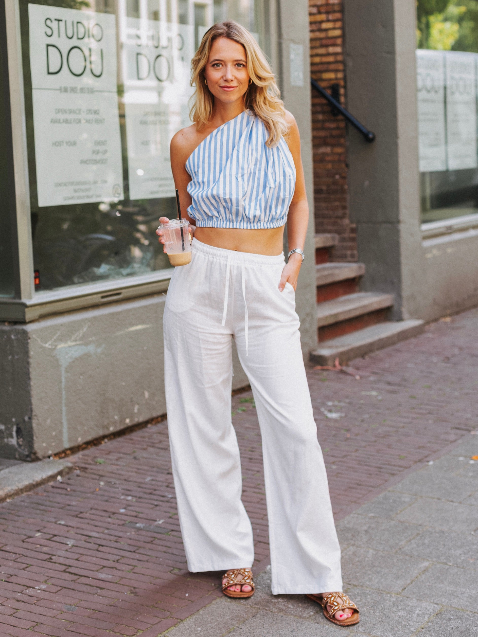 Deze heerlijke linnen broek heeft een koord waarmee je hem aan kan trekken om de taille.