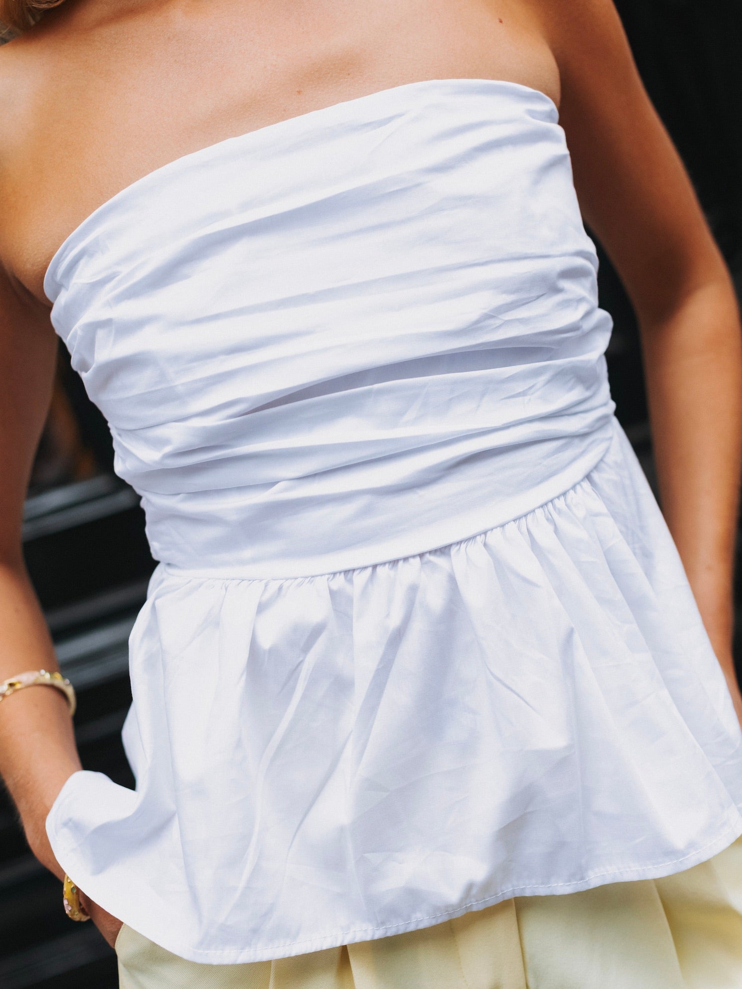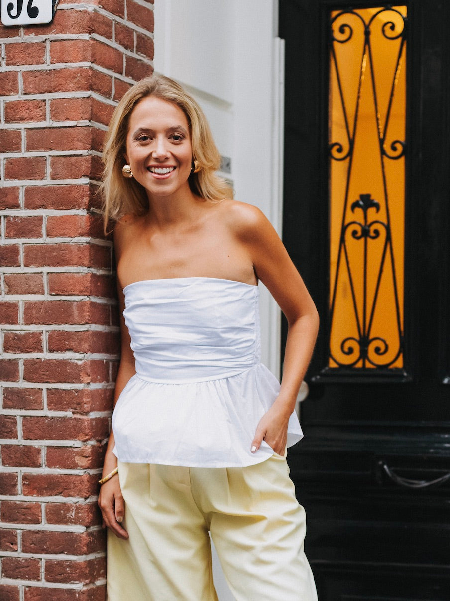 De Zuzu top is een elegante strapless top, aan de achterkant zit elastiek waardoor die comfortabel draagt. Er zit extra stof bij de buste, dus hij kan ook zonder beha gedragen worden.